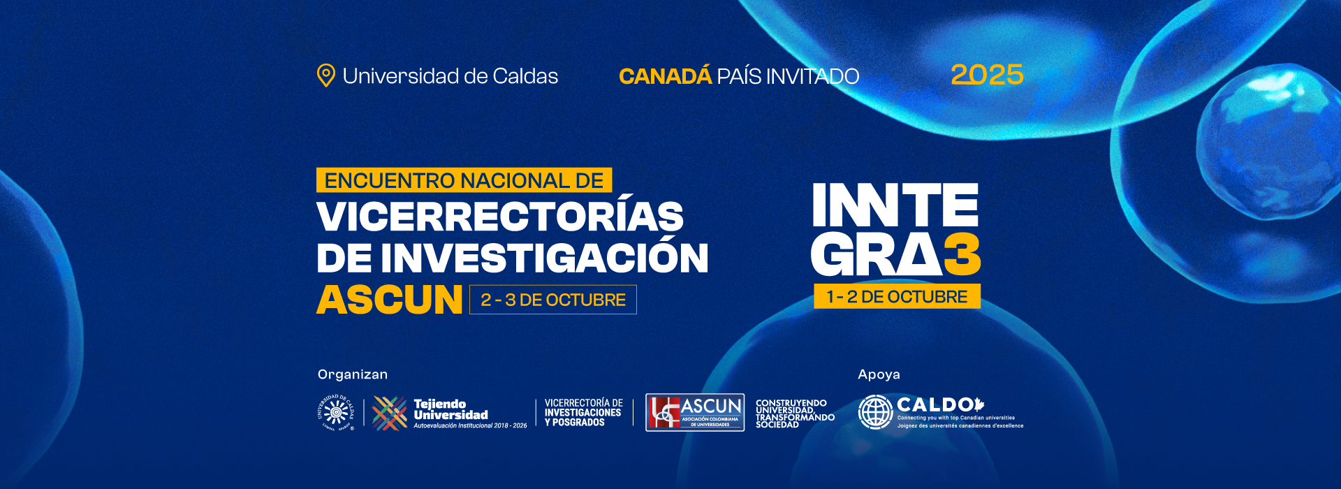 La Asociación Colombiana de Universidades – ASCUN, junto con la Universidad de Caldas como anfitriona, les da la bienvenida al Encuentro Nacional de Vicerrectorías de Investigación ASCUN 2025 e INNTEGRA3, que se realizará en la ciudad de Manizales, del 1 al 3 de octubre de 2025, en el marco de INNTEGRA 2025.